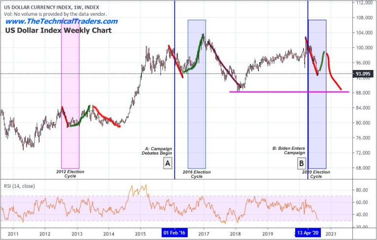Typically, the US Dollar declines over the 6 to 12+ months prior to a major US Presidential election cycle. Whenever there is a major contest for a new US President or an active and aggressive campaign between two individuals, there is a lot on the line. A US Presidential Election is not just about electing a President – it is about setting US, Foreign, Social, Economic, and Taxation polities well into the future. How businesses and voters interpret the benefits vs. risks usually decides the outcome fairly openly. Yet, global traders vote by deciding how much they believe in the policies and leadership in the new US President and/or how they interpret the risks related to new policies, laws, and regulations.