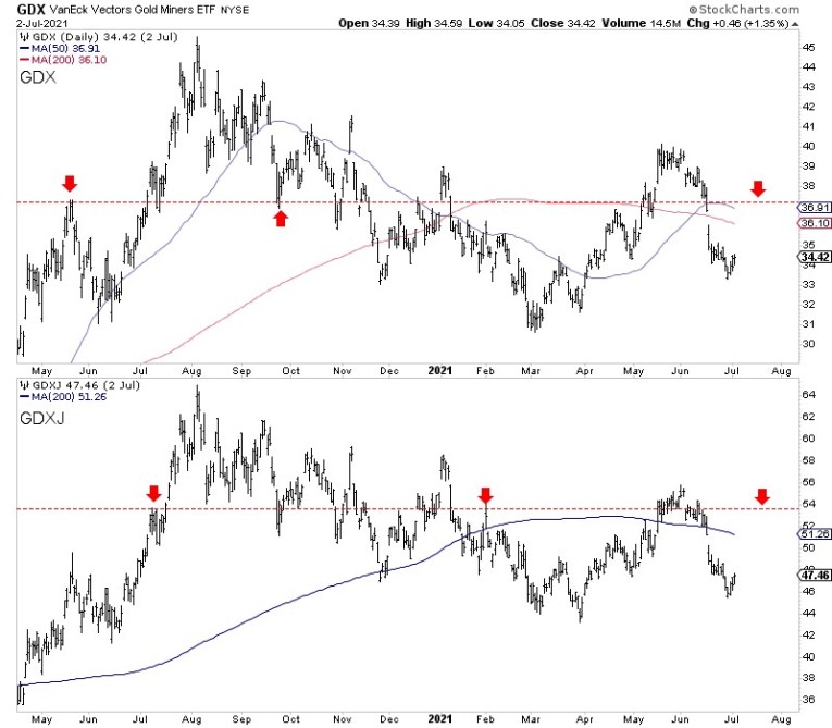 GDX has upside to $37 and faces some resistance from the moving averages at $36. GDXJ faces moving average resistance at $51 and lateral resistance at $53.