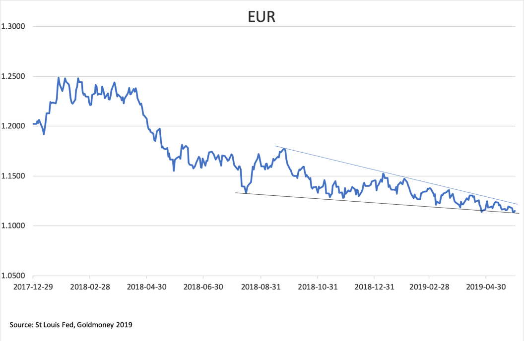 As our tariff and credit cycle mixture bakes in the economic cake, infinite monetary inflation will be the response. At some point, financial markets will wake up to the consequences. It could be sudden and relatively soon. The chart below, of the euro-dollar exchange rate warns us that the two most important fiat currencies are about to experience a sudden change in their relationship, likely to have far-reaching consequences.