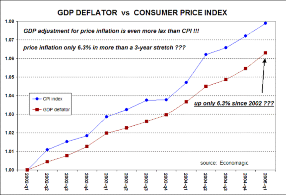 We all question USGovt official statistics on the economy. We understand easily that price inflation is far more than the CPI indicates in that Constant Price Index. We understand easily that the jobless rate is nothing more than the percentage of former workers who receive state jobless insurance benefits, with the discouraged unemployed not counted. Focus here is on the GDP, which stands for Gross Domestic Product, or is it the Gross Data Pollution? My argument is simple. The CPI overlooks a raft of rising categories with rising prices, like insurance, local taxes, college tuition, health care, cable TV and telephone taxes. The real CPI is perhaps 3% to 4% higher than the reported CPI. The big lie is couched within an obscure GDP Deflator. What the heck is that anyway?