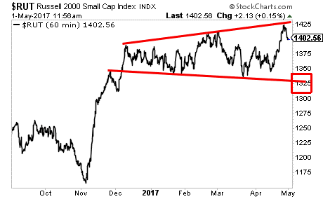 On that note, the Russell 2000 has just staged a final blow off push to the upside. And. It. Failed. The momentum here has shifted and we could drop to that red box (a 5% drop) in a matter of days.