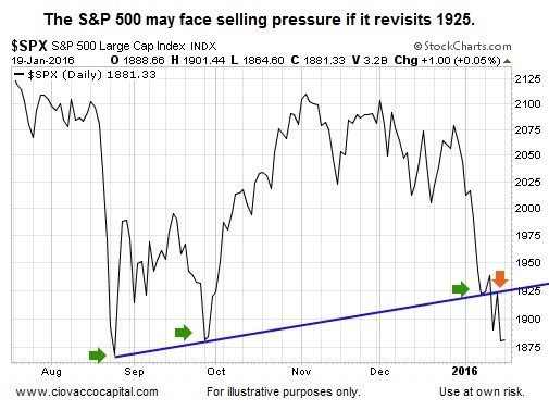 If we examine the 2016 S&P 500 daily chart using high, low, and closing prices, the bulls still have reason to hope. The lowest intraday low made in August 2015 was 1867. The S&P 500, thus far, has been able to remain above 1867 on a closing basis. Monday's close was 1881. The odds of bad things happening increase if 1867 is taken out on a closing basis.