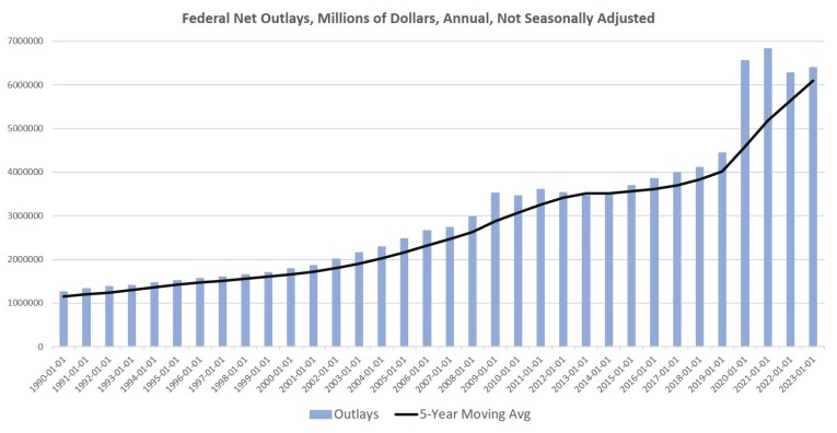 That's certainly not in the cards right now. Rather, the Republicans are seeking a tiny reduction in spending from the CBO 2023 estimate of $6.4 trillion down to slightly below 2022's spending of $6.27 trillion. Even with this slowdown, there is no danger of the 5-year moving average falling below where it was in 2022.