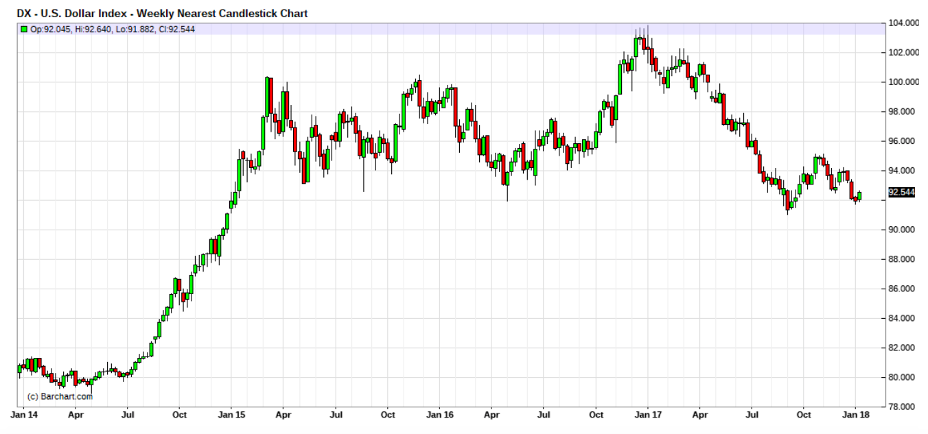 To that end, 2018 has begun with a continued fall in the broad-based US Dollar Index. As mentioned above, this index fell over 10% in 2017. If it soon drops below 90, it will be poised to fall a similar amount in 2018.