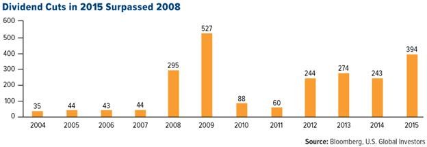 In addition, the number of companies trimming or altogether suspending dividends surpassed 2008 levels last year, according to Bloomberg. Nearly 100 more dividends were cut in 2015 than in 2008, suggesting further trouble could be brewing. Goldman Sachs reports that in the last three months alone, at least 20 oil companies have adjusted payouts down as crude prices continue to drag.