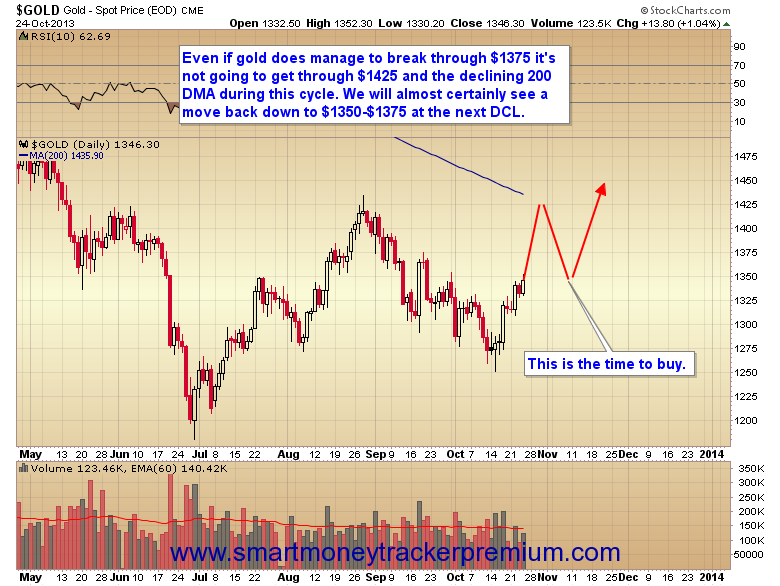 If on the other hand gold can manage to break through the $1375 manipulation zone, there is very little chance it is going to make it past the $1425 level and 200 day moving average before this daily cycle tops. At that point gold will almost certainly drop down into a daily cycle low that will retest the $1350-$1375 level before making another attempt at penetrating the $1425 zone.
