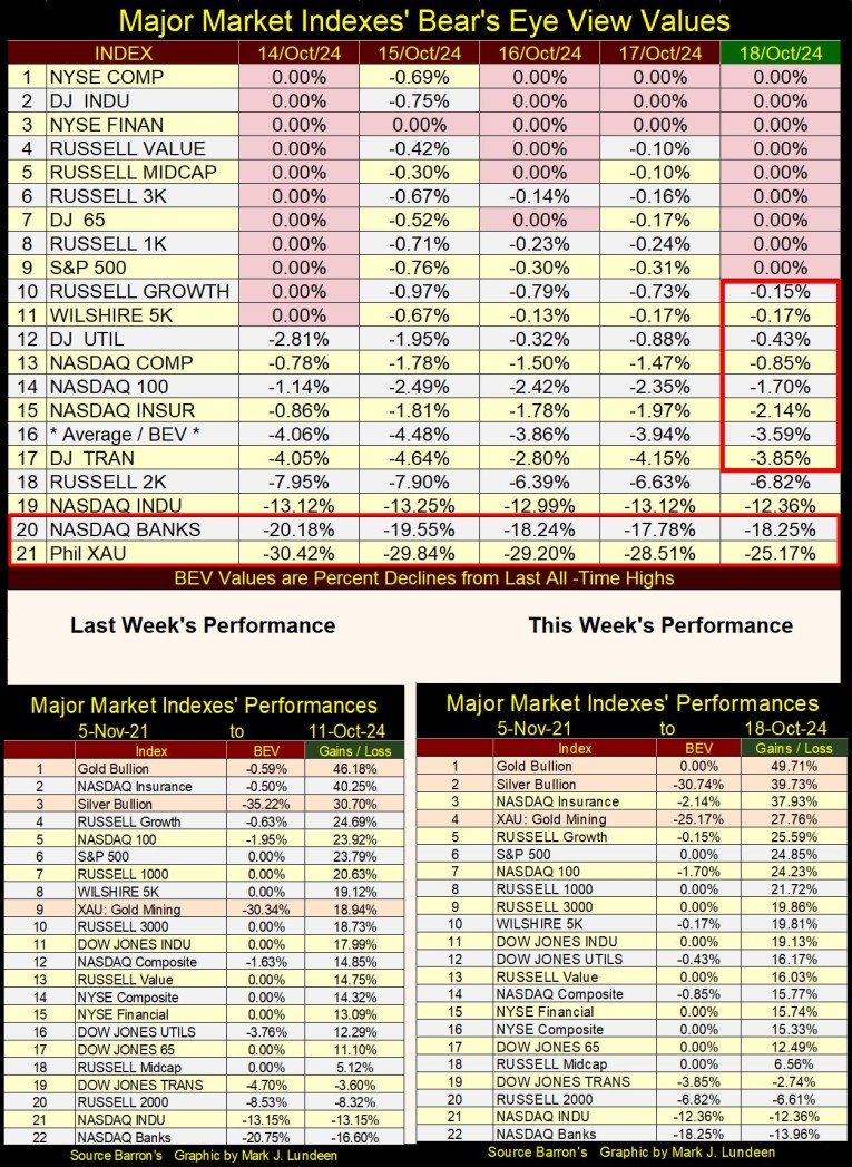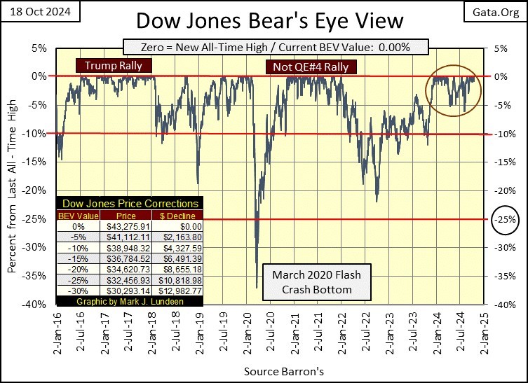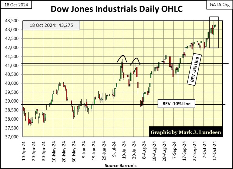Lastly, there is my chart for the Dow Jones in daily bars below. The BEV -5% line (41,112) is based upon the Dow Jones’ last all-time high, which this week was Friday’s close of 43,275. So, why did I extend this line across the chart, back to last April, when the BEV -5% line was only 37,817? Okay, I’ll tell you; I don’t need to, but this line visually looks good spanning across the chart below, so there it is. Same goes for the BEV -10% line.