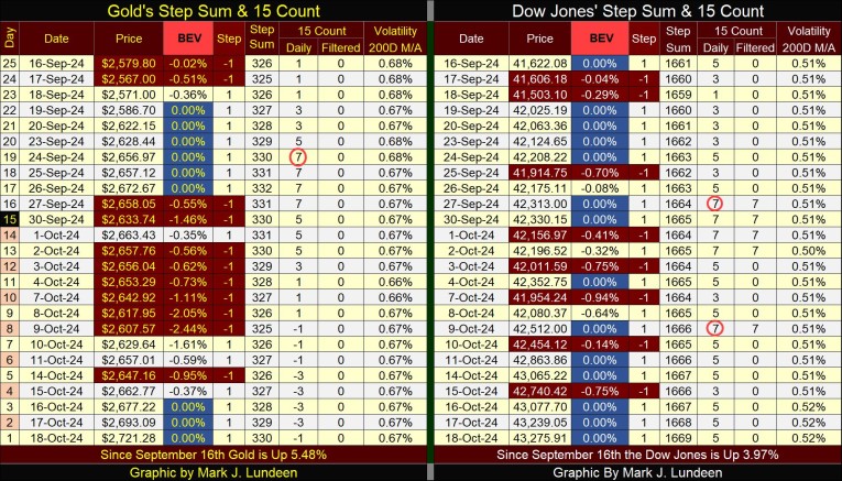 Next, we look at gold’s step sum table below. Gold became overbought in late September, with a 15-count of +7, then sold off from those levels. Not by much; only a BEV of -2.44% on October 9th, as its 15-count declined to a -1. Since then, once again daily advances began overwhelming daily declines, and this week gold saw three new all-time highs.