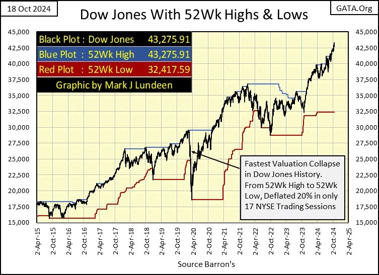 Below is a look at the Dow Jones in dollars (Black Plot), with its 52Wk High and Low lines (Blue & Red Plots), providing a more traditional view of the Dow Jones since 2016. Since 2016, the Dow Jones has pushed down its 52Wk Low line only three times in the past eight years. But note, since the Dow Jones entered scoring position last November, pushing up on its 52Wk High line has become a matter of habit for the Dow Jones, for each of its forty-seven new all-time highs.