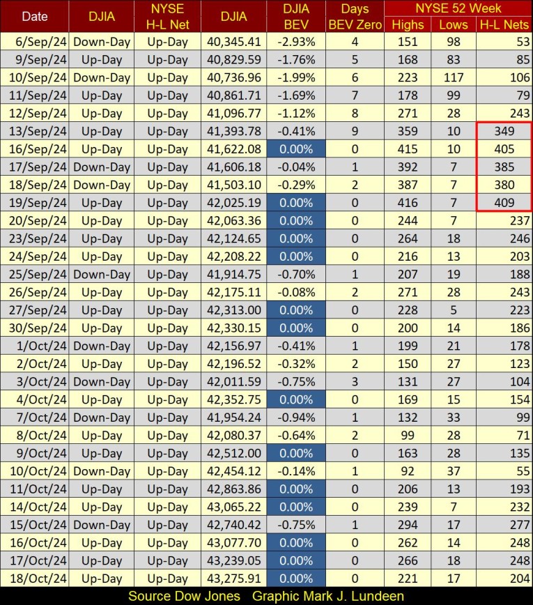 I like to note those days the H-L Nets exceed +/- 299; let’s call them 300 H-L Nets, as a H-L Net of +300 is a superior day at the NYSE, as is a H-L Net of -300 is a bad day at the NYSE. In mid-September, while I was recovering from my surgery, I see the NYSE saw a couple of +400 days for H-L Nets in the table below.