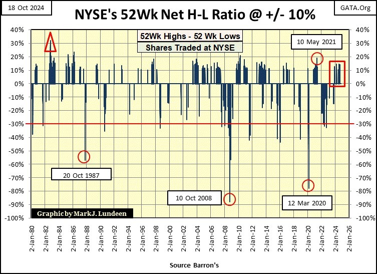 The strongest H-L ratio was on 11 October 1982 (Red Triangle below), where this ratio reached a +32%. But this was just months into the bull market that continues to this day. It is early in a bull market at the NYSE, that most issues trading enjoy great gains. As any advance matures over time, the market advance becomes more selective, as the major market indexes approach their last all-time highs.