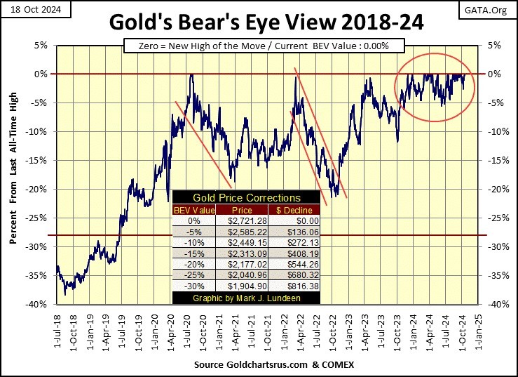 This week gold closed at $2,721.28. When it entered scoring position last November, it did so at $1,962.11, an eleven month gain of 38.69%. Much better than the Dow Jones’ gain of 23.11% since last November, though one could not see that when comparing the BEV charts for the Dow Jones and gold.