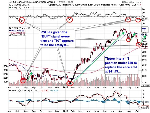 The vehicle of choice for me is the Gold Junior Miners ETF (GDXJ), and having completely missed the top in July-August above $50, I was stopped out two weeks ago at $41.43, triggering a lovely and very well-earned capital gain. Sadly, not having 75% of my net worth on the proverbial line every day was disturbing, and for the past three weeks, the lack of stress has transformed me into a slovenly "gentleman of leisure," complete with weight gain and addictive behaviors. Accordingly, in an effort to restore my spouse-annoying, dog-harassing self to normalcy, I am going to tiptoe back into the GDXJ market by buying the opening this morning with 25% of allocated capital. I might be early or I might be dead on, but the only "technical" tool I am using is the RSI numbers. Every other technical "tool" is veritably useless, as are the geeks that read tea leaves from the bottom of the cup.