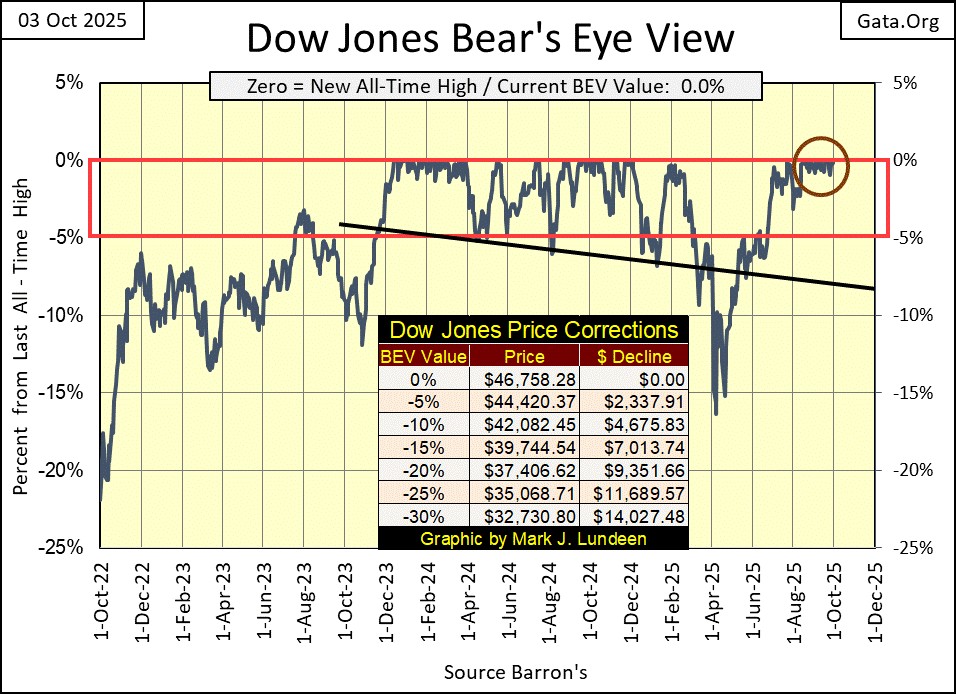 I still like looking at markets using the Bear’s Eye View (BEV), using new all-time highs, and the percentage claw-backs from them. But when studying a market, it is important to study it using different types of charts, to get the full view of the market. Which for the Dow Jones and gold in October 2025, their differences are very dramatic.