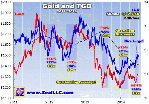 Things reverted back to normal amidst gold’s latest upleg in early 2014. TGD positively leveraged gold’s 16% gain by 4.4x, soaring 71%! And just over the last few weeks, TGD has really embraced a rare summer gold rally by surging 48% to gold’s 6.7% (stellar 7.2x leverage). Time will tell whether a new gold upleg is being born, but what is clear is that TGD is wound tight and ready to spring on any upward momentum in its underlying metal.