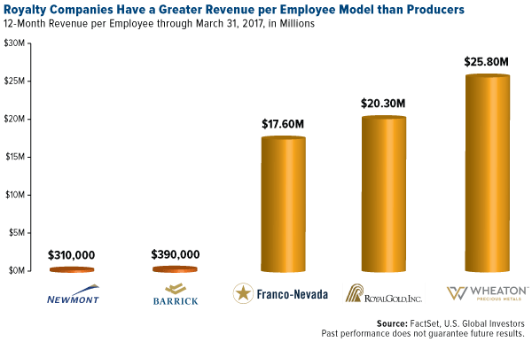 Last time I wrote about these companies, I shared with you that the three big royalty names boast impressive sales per employee. This is still true. Take a look at the 12-month revenue per employee of Franco-Nevada, Royal Gold and Wheaton Precious Metals. Wheaton has only around 30 employees, but has one of the highest rates in the world, generating $25.8 million per employee. By comparison, Newmont, which employs around 30,000 people, generated $310,000 per employee during the same period. Barrick also falls short by comparison.