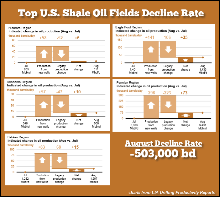 According to the newest EIA Drilling Productivity Report, the top five U.S. Shale Oil fields monthly oil decline rate is set to surpass a half million barrels per day in August. Thus, the companies will have to produce at last 500,000 barrels of new oil next month just to keep production flat.