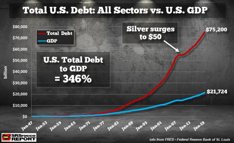 Here is my last update for the U.S. Total Debt All Sectors versus the GDP, for the beginning of 2019: