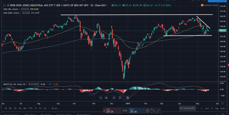 For the Dow, the market’s best fund indicator by volume is the SPDR Dow Jones Industrial Average ETF (DIA), which closed at 256.67 on Monday and is holding just above important short-term support levels from March 22, 2019 (at 252.46). The ETF has already broken its 50-day and 200-day exponential moving averages, and prior bearish divergences in the MACD indicator have been confirmed with a negative turn in the histogram.