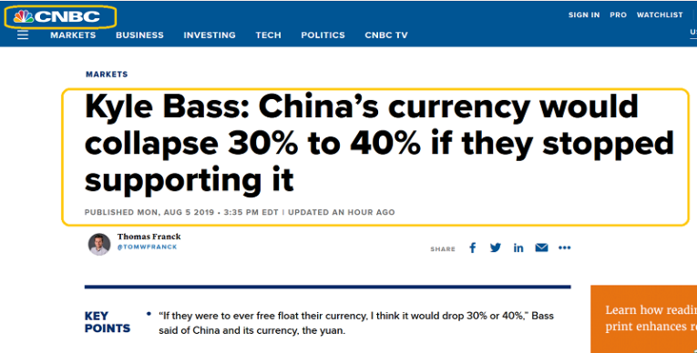 Kyle believes the yuan would fall from 7 yuan per dollar to about 10 per dollar if China stopped supporting the yuan. I believe it would fall much more than that if China really attempted to manipulate the yuan lower!
