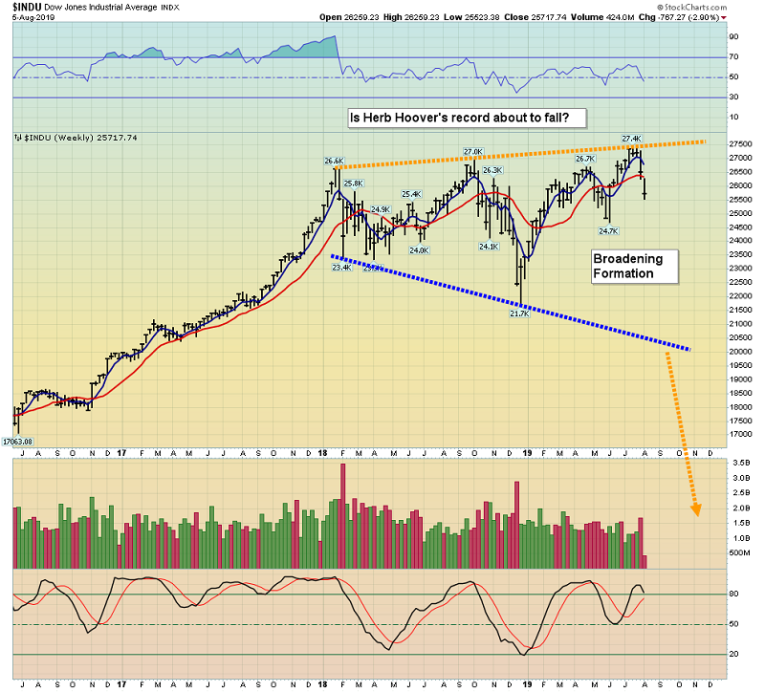 That helped the Dow fall a record 90% from its highs, but as this US business cycle peaks I think President Trump could possibly break Hoover’s record and pound the Dow more than 90% lower with more of his tariff taxes.