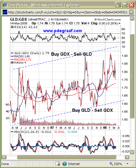 Featured is the chart that compares the GLD (gold bullion ETF), to the GDX (gold mining stocks ETF). While the 2 year trend favors the GLD, you can use a strategy of buying the GLD at the bottom support line, and the GDX at the top of the channel, thereby benefiting from the trend. If and when gold stocks begin to outperform bullion, you will find yourself staying longer with the GDX. This method of trading does not provide specific entry points, but it does offer a solid choice, once a decision to buy has been made.