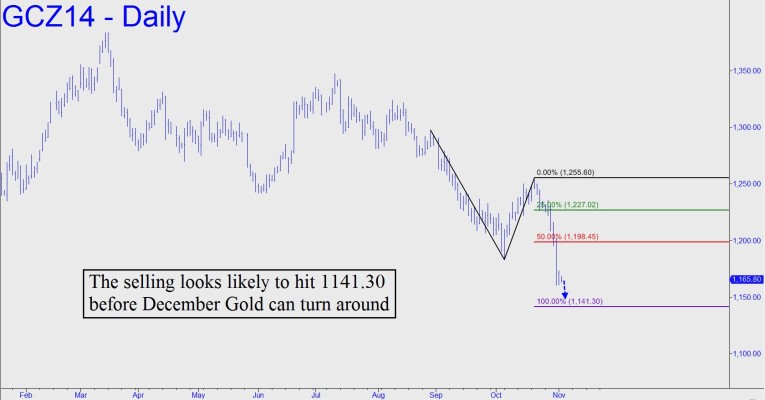 I have lower targets outstanding, including a big-picture support at 1125.00, but the one shown at 1141.30 should be used as a minimum downside objective over the very near-term. Traders should position from the short side until it is reached, but be aware that a rally back up to the midpoint pivot (i.e., the red line at 1198.45) would be neither unusual nor especially bullish. More likely is that it would be a bull trap — one making gold an even more enticing short than it is from these levels. Most immediately, if you’re successful catching a profitable ride south, I’d suggest using some of your gains to create a generous stop-loss for a long initiated at 1141.30, a Hidden Pivot that looks like to engender a bounced that is both precise and tradable. What would it take to turn the short-term picture quite bullish? Answer: a print today at 1177.30.