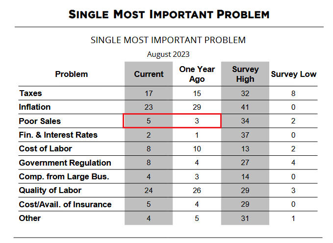To explain, the NFIB released its Small Business Optimism Index on Sep. 12. Throughout 2021 and 2022, we highlighted how the percentage citing poor sales as their “Single Most Important Problem” was near an all-time low.
