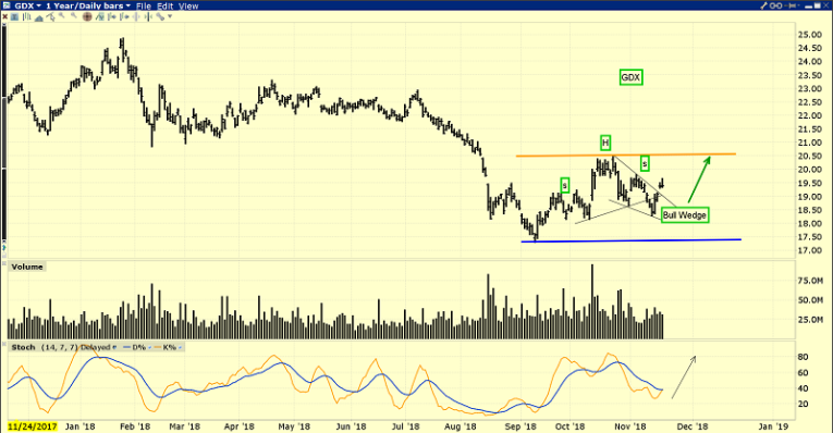 Note how quickly GDX has surged back above the neckline of that pesky H&S top pattern after breaking down. That’s positive action and now there’s a bull wedge in play too!