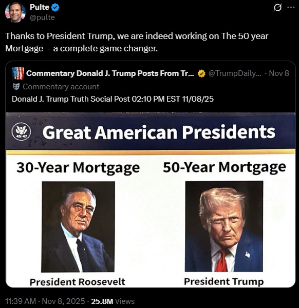 Aside from reminding us that Trump is a big fan of the Progressives’ hero Franklin Roosevelt, the image did indeed point to a new initiative from the administration. This was apparently confirmed on Monday by Federal Housing Finance Agency Director Bill Pulte. Pulte wrote on social media: ”Thanks to President Trump, we are indeed working on The 50 year Mortgage—a complete game changer.”