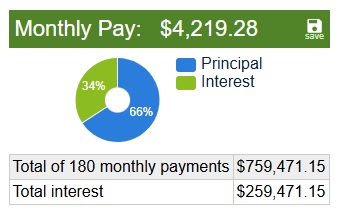 For example, if a home buyer borrows $500,000 for 15 years at 6 percent, the borrower will pay a total of $259,471 in interest over the life of the loan. So, he ends up paying nearly $760,000 in principal and interest combined (not including taxes and insurance).