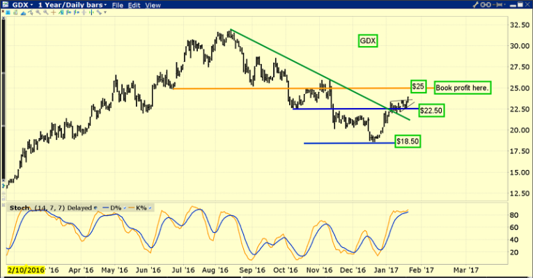 GDX is breaking out of a small ascending triangle, and making a beeline towards my $25 target zone.