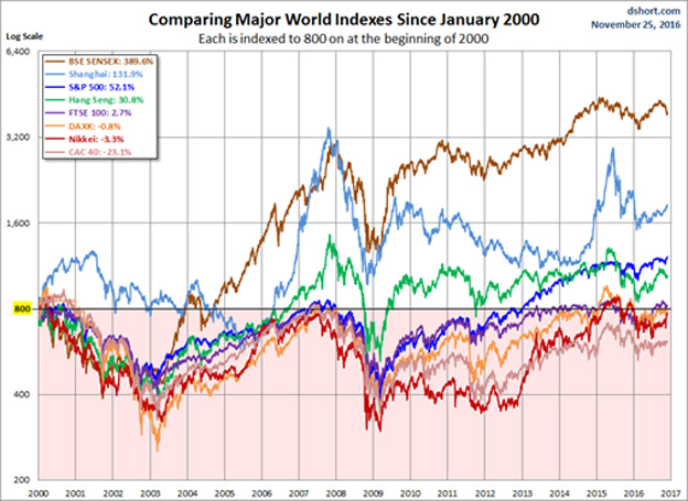To see an example of gold’s potential, look at this chart showing the performance of eight major global stocks markets since 2000.