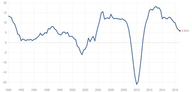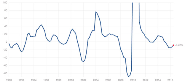 Companies have been issuing debt to buy back shares, raising earnings per share in the process. For example, Apple’s debt has grown from $17 billion in 2013 to over $75 billion in 2016. At the same time, shares outstanding have been reduced from 6.6 billion to 5.3 billion—a 20% reduction—and boosting earnings per share in the process. If Apple had the same number of shares outstanding in the current fiscal year as it did in 2015, its earnings per share would have been 5.1% lower. Given Apple’s 2016 revenue of $215 billion, this is not an insignificant figure.