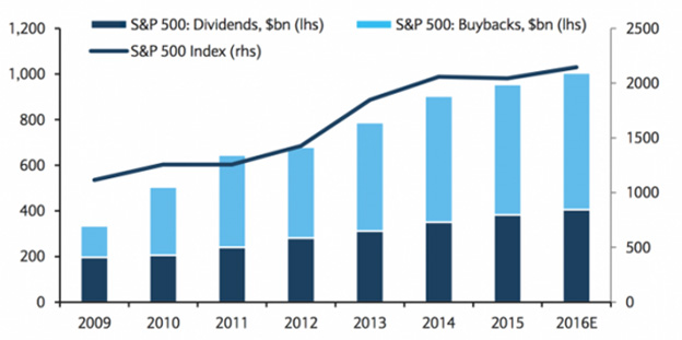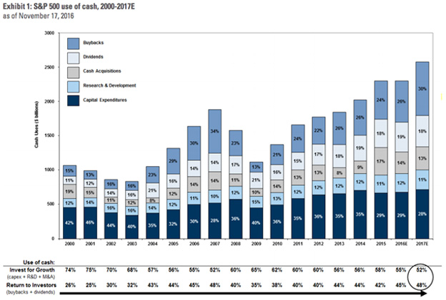 Buybacks now account for 26% use of corporate cash—up from 13% in 2009—and forecast to be 30% in 2017, an 11% annual growth rate.