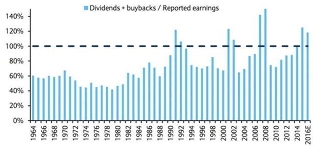 In Q3 2016, S&P500 revenues grew by 2.5% YOY, ending a string of six straight quarterly declines. However, earnings per share managed to increase 4.3%. As companies have struggled with top-line growth since the financial crisis, they have employed another measure to appease Wall Street analysts and investors.