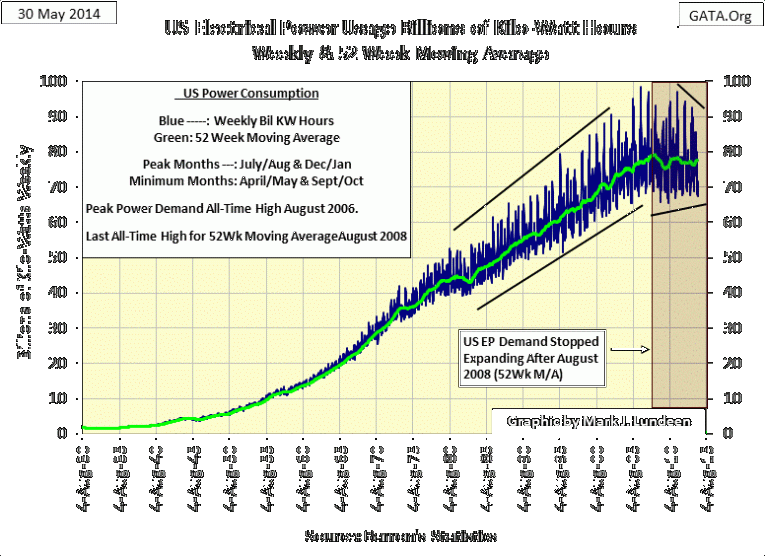 This makes EP seen above a darn good measurement of “global warming” for North America. Eight years ago in August 2006, U.S. EP saw its last all-time high peak; the summer of 2006 must have been a hot one. Since then seasonal demand for electrical power during the summer has declined, most likely for reasons of “global cooling” in North America. I have a trend line over the past three summer’s peaks in the chart; 2011 was less than 2006, and 2012 & 2013 continued the trend. So far in 2014, the Upper Midwest is three weeks behind the season if you can believe my local meteorologist, which I do as I have only turned on my AC this week which is unusual this late into summer.