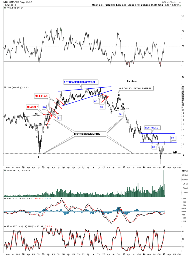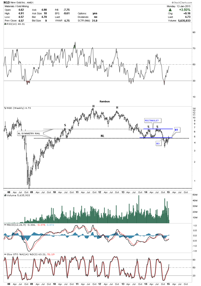 The weekly chart for GG shows it trying to breakout from a small double bottom. It could backtest the bottom rail of the blue bearish rising wedge again.