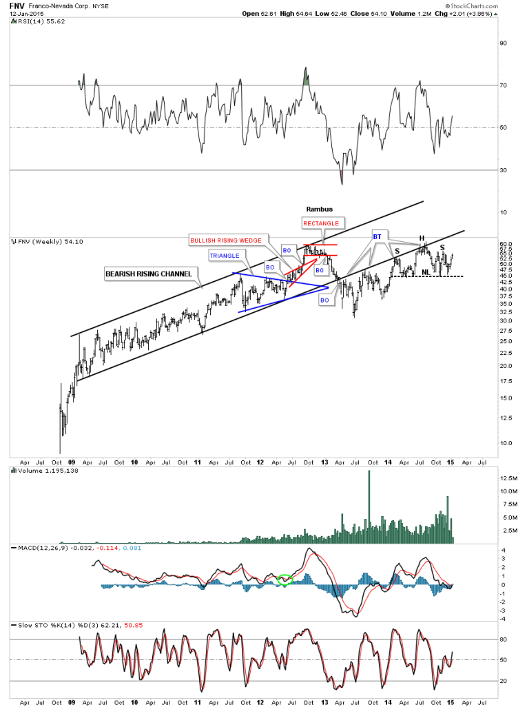 FNV is still trading below the bottom rail of the huge rising channel. Maybe it will backtest the bottom black rail again for the 5th time if the PM stock remain buoyant.