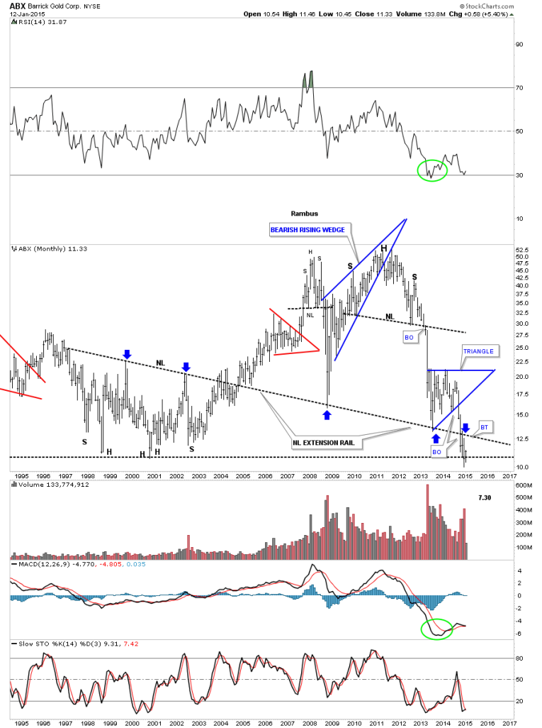 Let's now look under the Hood to see what is running these indexes starting with one of the big ones ABX. The monthly chart shows where the neckline extension rail may come into play if we get this counter trend rally to the upside.