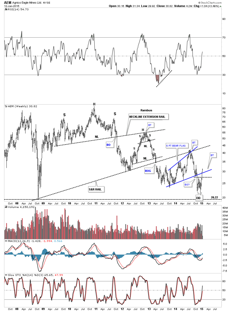 AEM is showing some strength after breaking out from its double bottom and is now breaking above the bottom blue rail of a 6 point expanding bear flag.