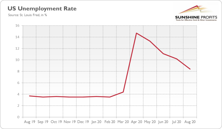 Great news for the U.S. labor market: according to the BLS, the American economy regained 1.4 million jobs, while the unemployment rate fell below 10 percent for the first time in the pandemic era! To be more precise, the unemployment rate declined from 10.2 percent in July to 8.4 percent in August, as the chart below shows.