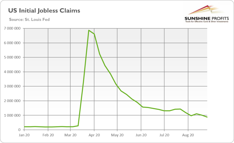 Another example showing that investors should always take headline numbers with a pinch of salt, are the initial jobless claims. They fell sharply by 130,000 to a seasonally adjusted 881,000 in the last week of August (see the chart below), but the decrease was caused by a methodological change in how the data is adjusted to account for seasonal swings in employment.