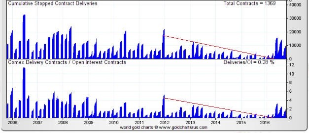 In the above-linked post I included a chart showing that the amount of gold delivered to futures ‘longs’ over the preceding two years was much less in both absolute and relative terms than at any other time over the past decade. The chart made it clear that as the gold price fell, the desire of futures traders to ‘stop’ a contract and take delivery of physical gold also fell.