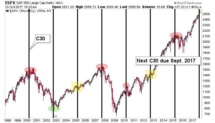 Another leg was the 30 month cycle that has caught 5 of 7 important tops or bottoms (4 tops, 1 bottom) since 2000. As noted when it was first presented, this monthly chart takes into account months of slush in and around the 30 month mark, so it is far from an exact timer. The S&P 500 remains in the window with the September bar now in play.