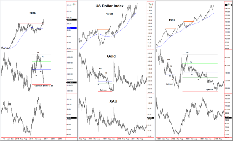 We continue to monitor the seventeen-year cycle in the US Dollar Index and its relationship with gold. Looking at gold since the Dollar bottomed in May, the patterns of 1999, 1982 and 1983-85 are a close match. The Fibonacci levels come into play in each instance.