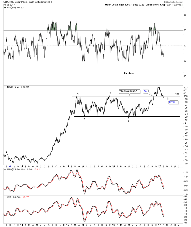 This first chart is just a simple daily line chart which shows the US dollar closed just below the top rail today at 99.84.
