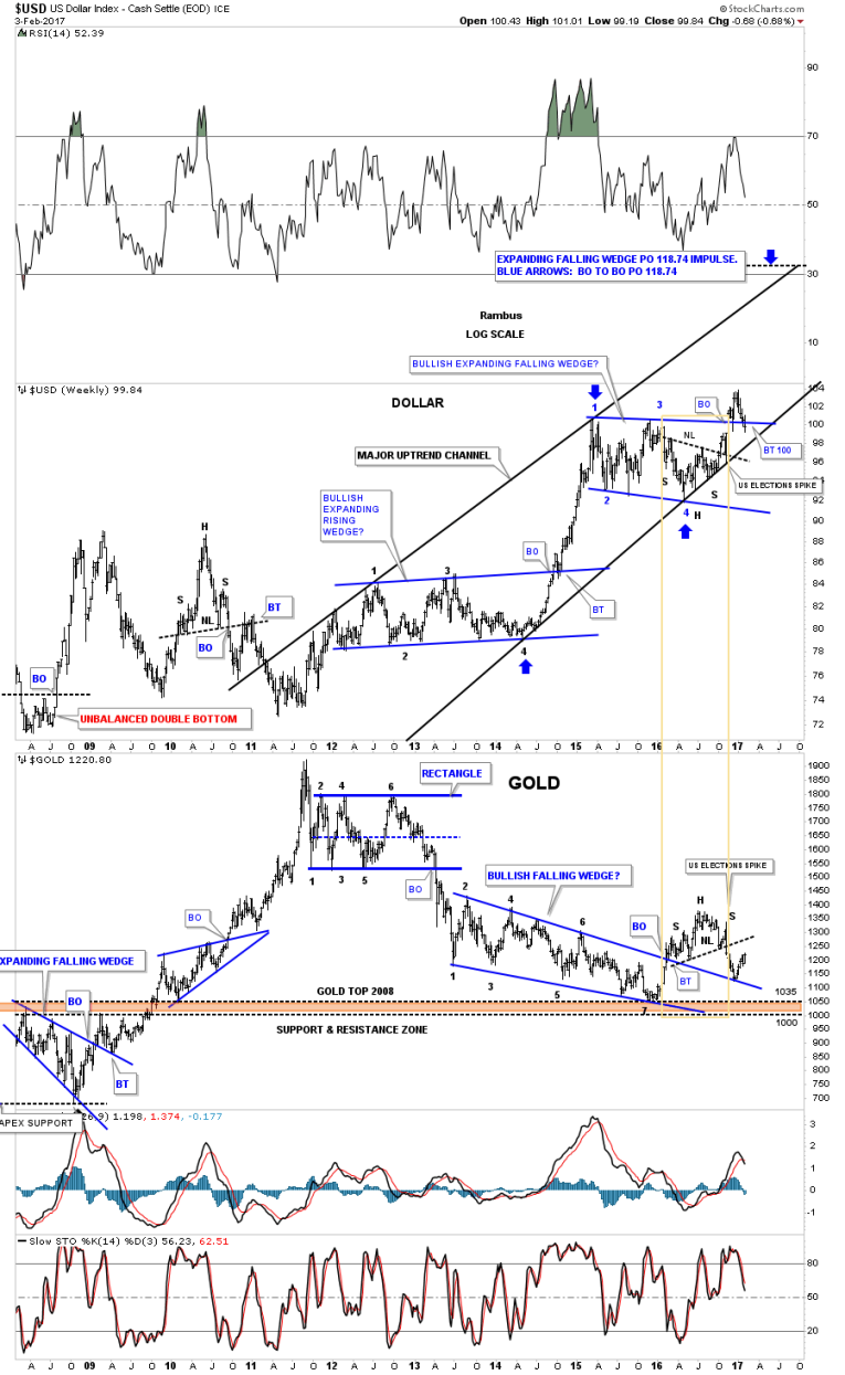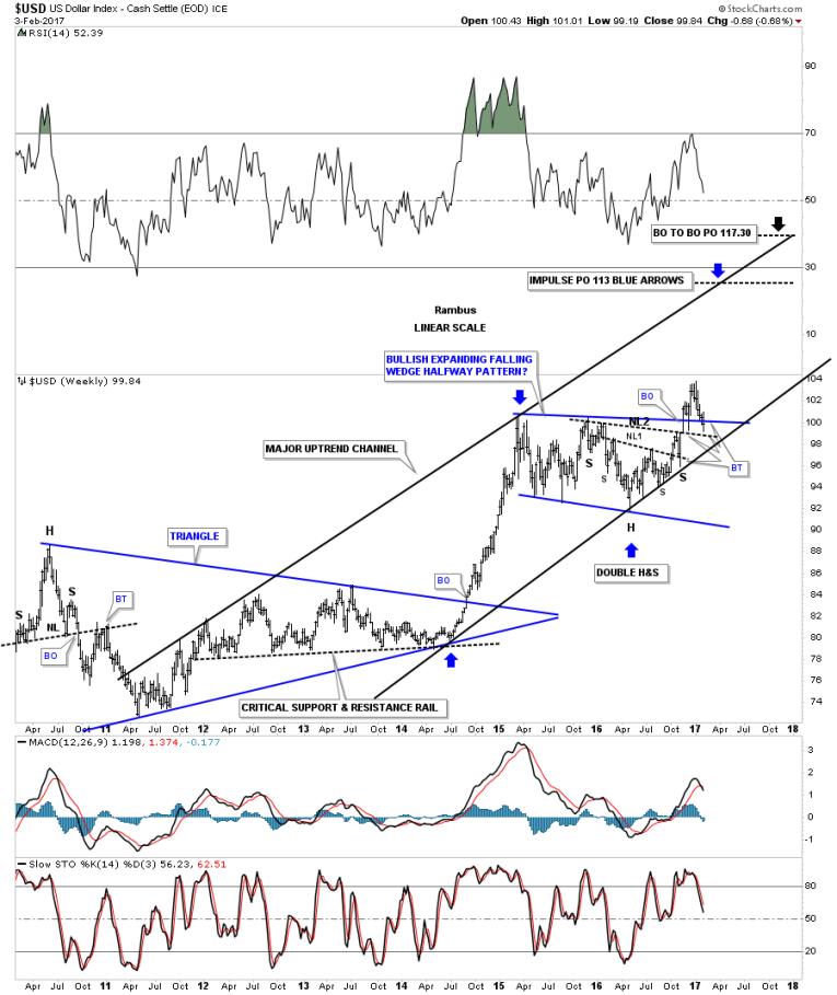 This next weekly chart for the US dollar puts all the pieces of the puzzle together. This chart shows the blue trading range with the double H&S bottom with neckline #2 almost being backtested this week. The major uptrend channel began in 2011 at the same time gold topped out. If the bottom rail of the major uptrend channel gives way that’s where I wave the white flag and surrender to the bears.