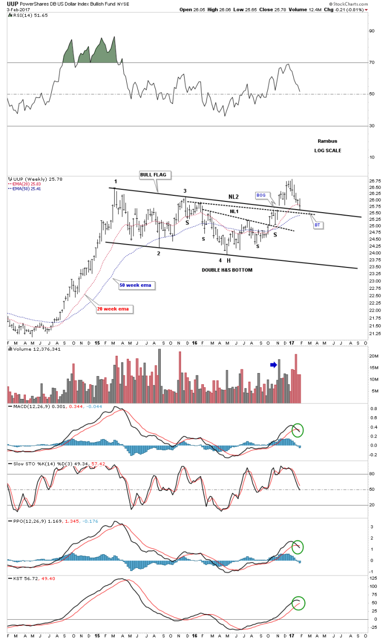 After putting in its bear market low in 2011 the UUP (US Dollar ETF) has been in a strong bull market creating its first consolidation pattern just below the top rail of the downtrend channel. After completing that first impulse leg up, that started in the summer of 2014, the UUP went on a vertical move up to the first reversal point in the upper blue flag where it need to rest.