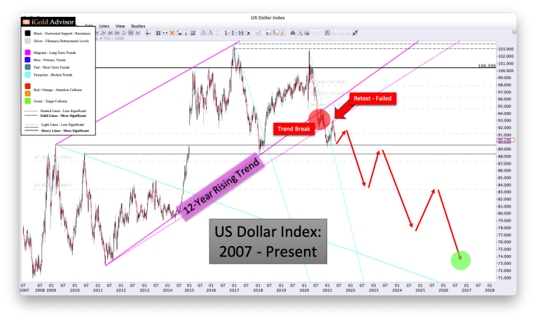 - The dollar broke through its 12-year rising trend (magenta) in late-2020 (red callout). This trend break shows us that the preceding years of the dollar advancing against its foreign currency counterparts has come to an end.